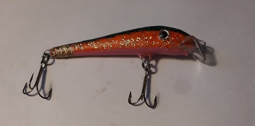 Vaapussa on vihreä hileselkä, oranssit kyljet hologrammi kultahileellä ja salmon pinkki maha.